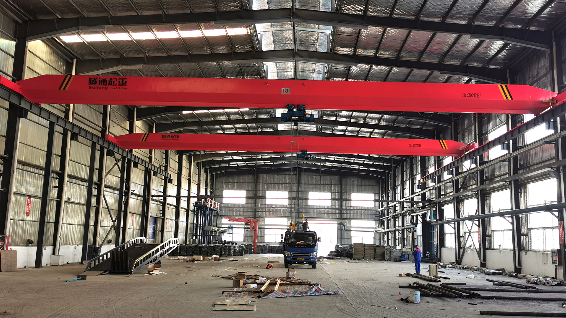 LD型電動(dòng)單梁起重機(jī)主要由起重機(jī)主梁橋架、鋼絲繩電動(dòng)葫蘆、大車運(yùn)行機(jī)構(gòu)以及電氣系統(tǒng)四個(gè)部分組成,具有安裝方便,高效運(yùn)輸?shù)奶攸c(diǎn)。運(yùn)行機(jī)構(gòu)采用分別驅(qū)動(dòng)形式,配置三合一運(yùn)行電機(jī),性能穩(wěn)定,低噪運(yùn)行;橋架主梁采用由熱軋卷板經(jīng)卷板校平剪切生產(chǎn)線下料成整張腹板,并與工字鋼拼焊成實(shí)腹梁;端梁則由鋼板經(jīng)激光切割整體下料成型,再拼焊組裝車輪完成;起升機(jī)構(gòu)由性能穩(wěn)定的鋼絲繩電動(dòng)葫蘆組成,能夠平穩(wěn)起升吊運(yùn)重物,并可以沿著主梁橫向移動(dòng);大車運(yùn)行機(jī)構(gòu)采用三合一驅(qū)動(dòng)電機(jī),裝配緊密,運(yùn)行無噪音。同時(shí)采用國內(nèi)知名品牌扁電纜,保證供電安全穩(wěn)定。